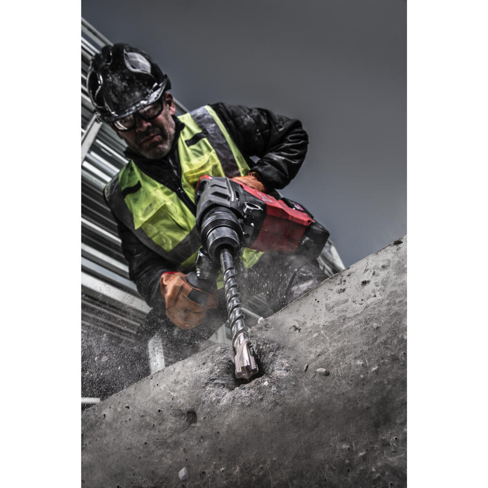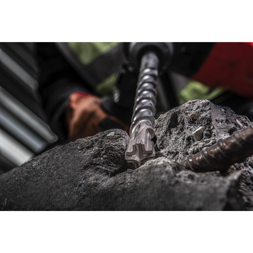 • Große Hartmetallschneide mit Armierungsfasen an jeden Schneidenende. Geringere Vibrationen und besser Bohrleistung in Armierungseisen für längere Standzeit