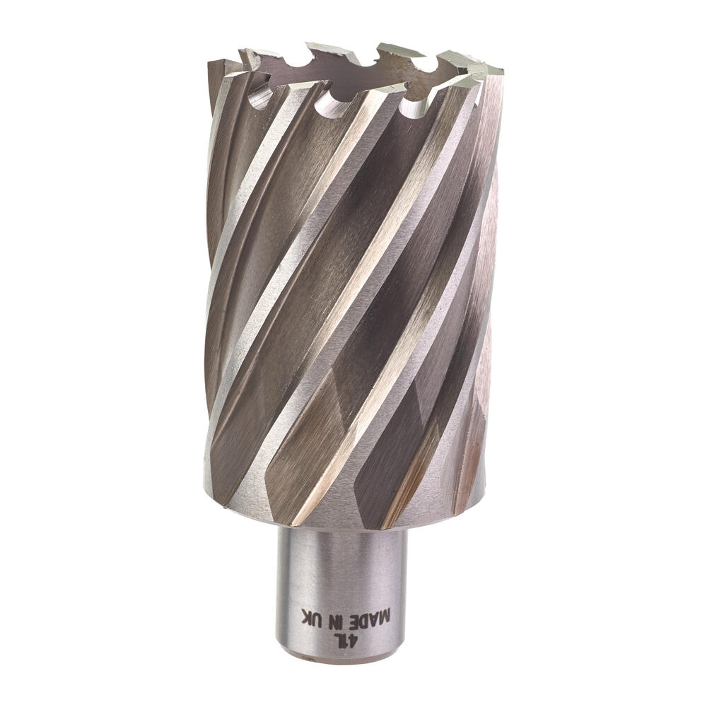 • 100% schneller: Kernlochbohrer haben aufgrund ihres Schneidverhaltens eine deutlich kürzere Bohrzeit als Spiralbohrer. Kernlochbohrer zerspanen nur die Zahnbreite, der Bohrkern wird ausgeworfen. Bei Spiralbohrern wird der komplette Bohrkern zerspant, sodass der benötigte Kraftaufwand und die Antriebsleistung sehr hoch sein müssen