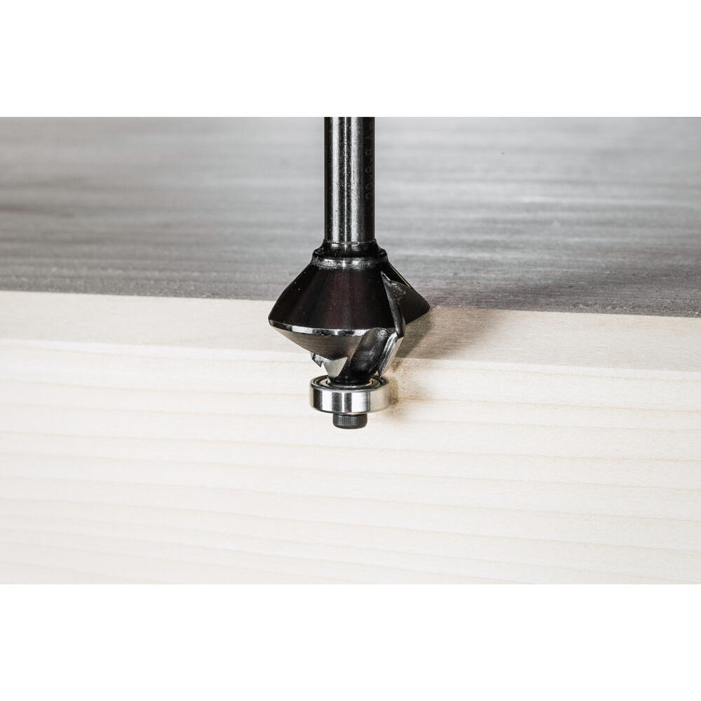 • Wendeplatten-Fasenfräser mit zwei austauschbaren Wendeplatten. Mit unten gelagertem Kugellager für selbstführende Führung ohne Schablone
